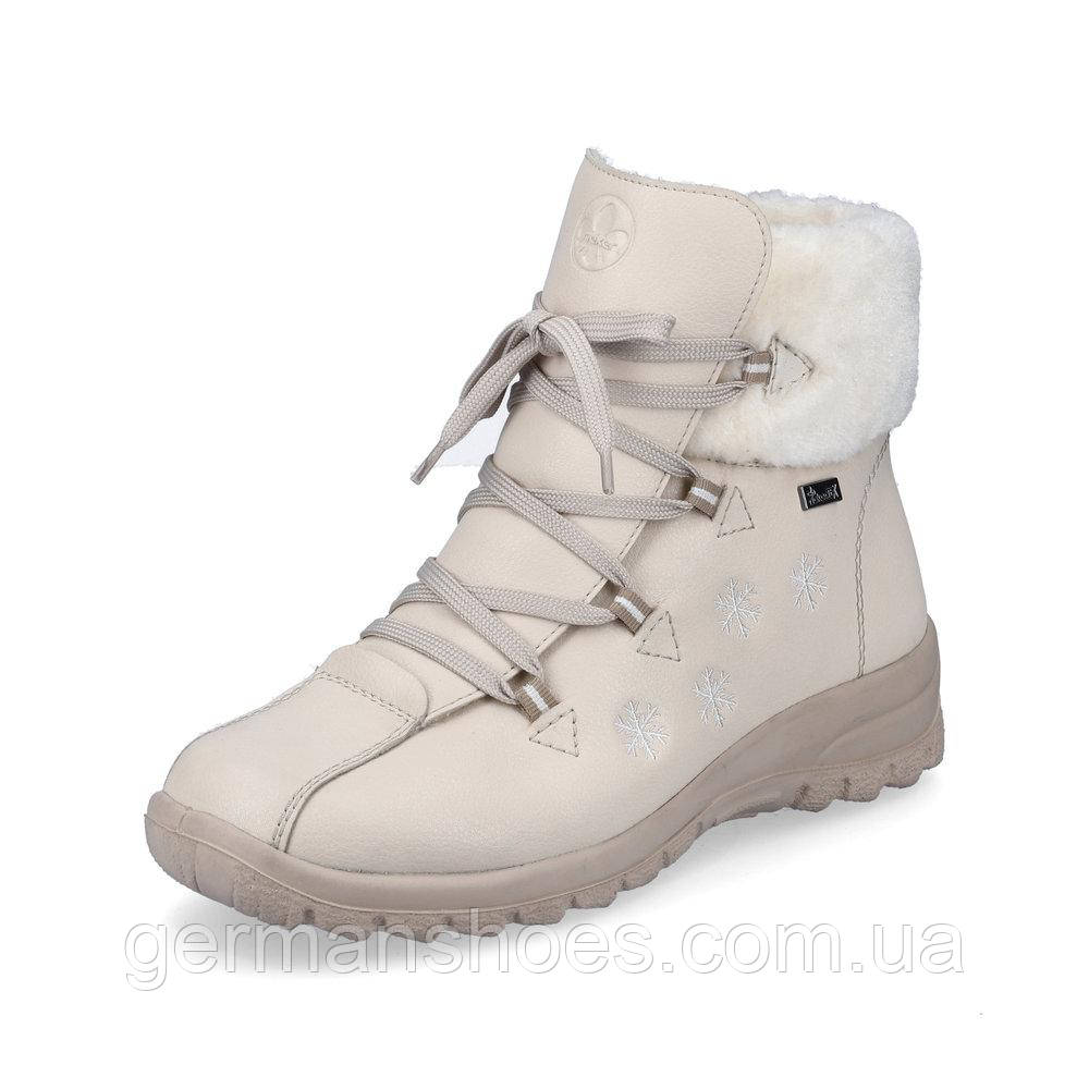Жіночі зимові черевики Rieker з натуральної шкіри молочного кольору, всередині – натуральна набивна вовна та мембрана RiekerTEX. Повна вулканізація підошви для захисту від вологи. Застібка-блискавка та шнурівка для ідеальної посадки на нозі. Легкі та зручні черевики від Rieker на кожен день!